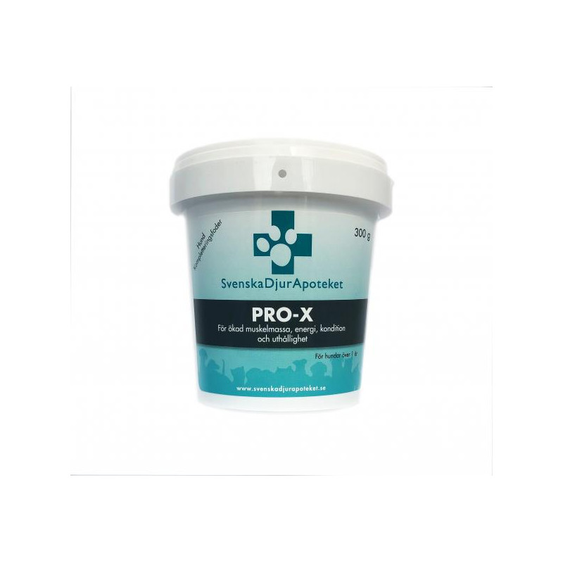 Tillskottet bidrar till att din hund får mer energi, bättre prestande, kondition och uthållighet. Pro-X är välsmakande samt lättupptagligt för hunden och har låg allergipotential och används främst vid muskeluppbyggnad.